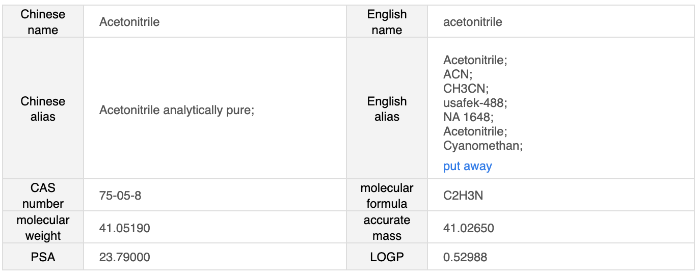 化学式 CH3CN または c2h3n [3] を持つ有機化合物であるアセトニトリルは、優れた溶媒性能を備えた無色透明の液体です。さまざまな有機物、無機物、ガス状物質を溶解でき、水やアルコールと無限に混和します。アセトニトリルは重要な有機中間体であり、典型的なニトリル反応を起こすことができ、多くの典型的な窒素含有化合物の調製に使用されます。